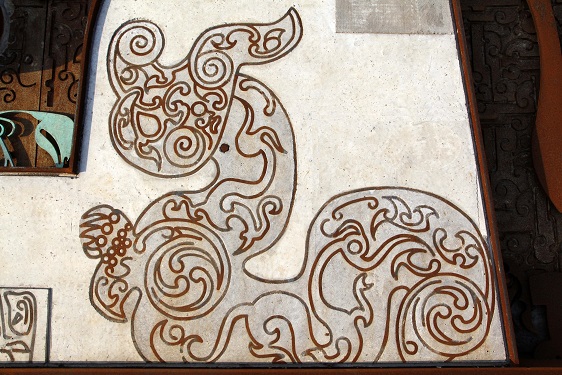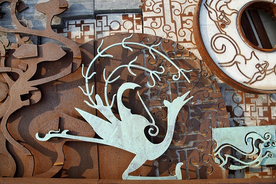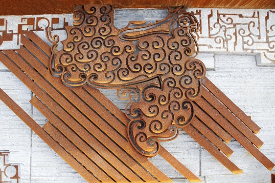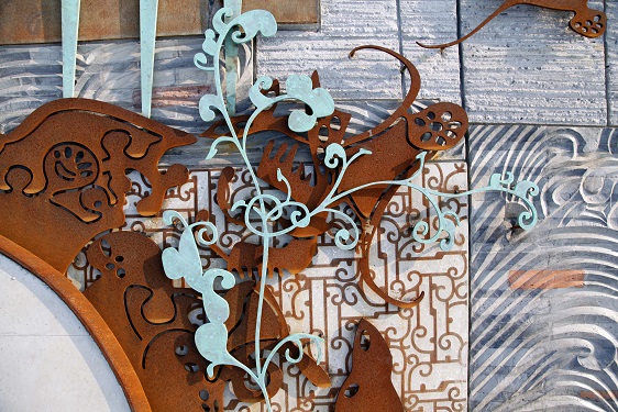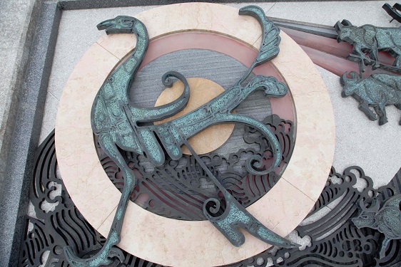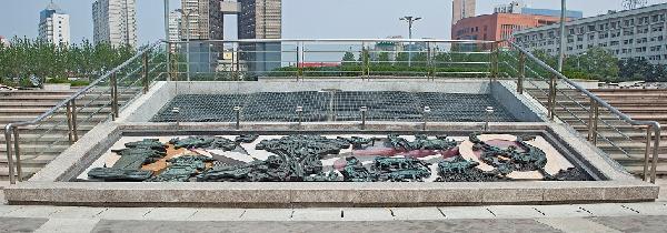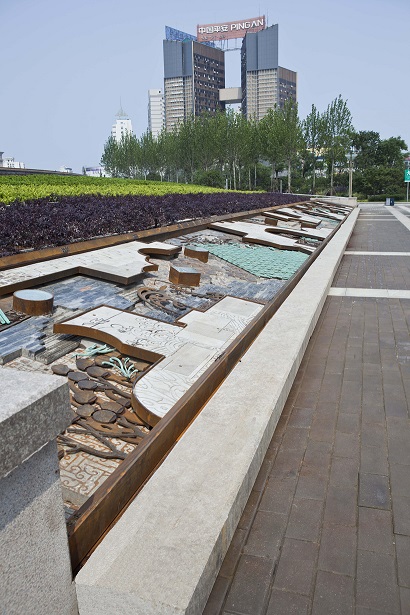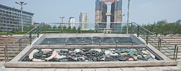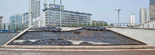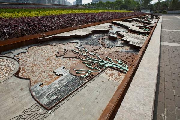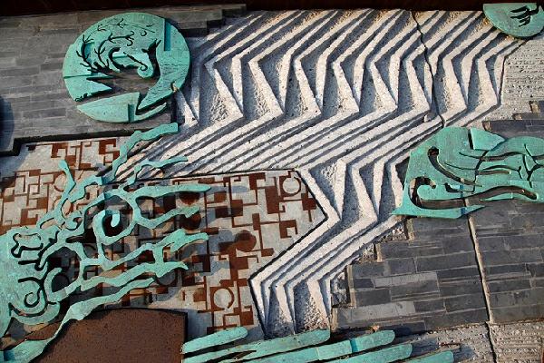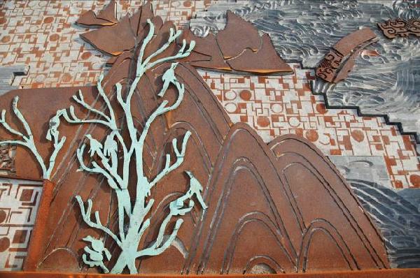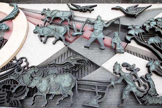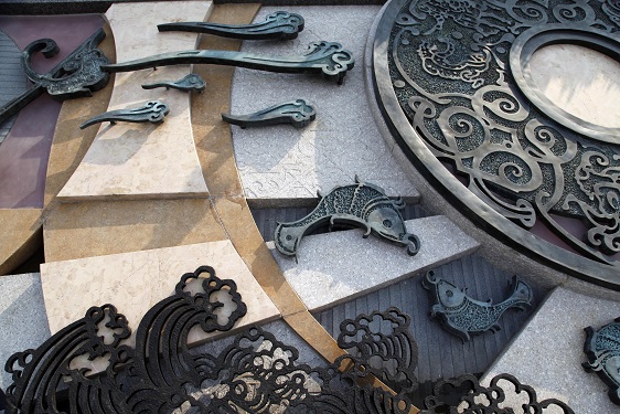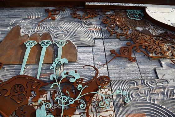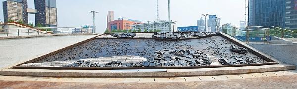 《楚史》分为“创始篇”、“政治篇”、“军事篇”、“文化篇”四幅作品,容纳了十则经典楚事,从四个方面展现楚国在中华历史长河中书写的精彩华章。艺术家通过选取楚文化中具有象征意义或经典造型的系列符号、图案,通过解构重组、类比链接、阴阳互衬、阵列生发等现代艺术形式、语言,运用混凝土、青砖、耐候钢、铜和水琉璃这些材料,进行叙事性与抒情性兼备的创作,既保持了楚文化的古朴风貌,又体现了现代语境下楚文化传承与创新。