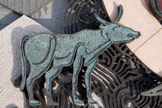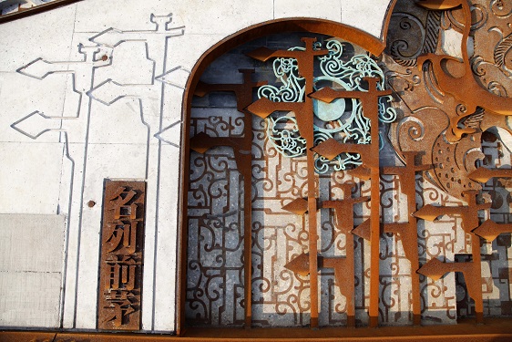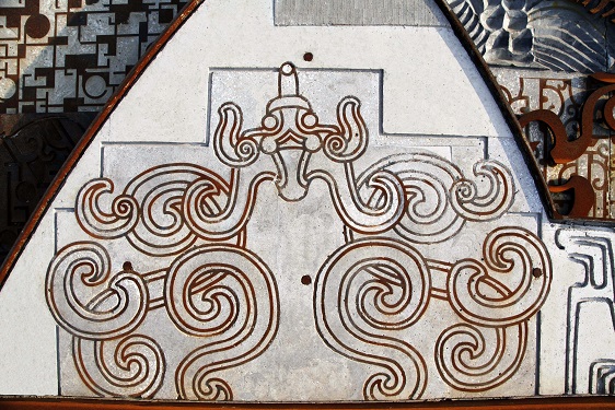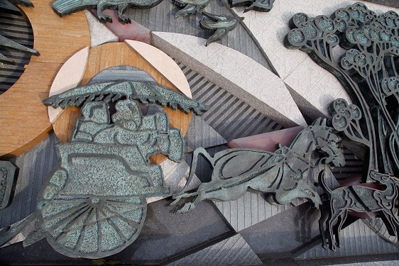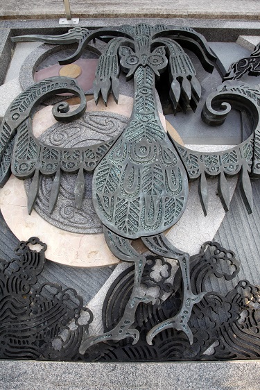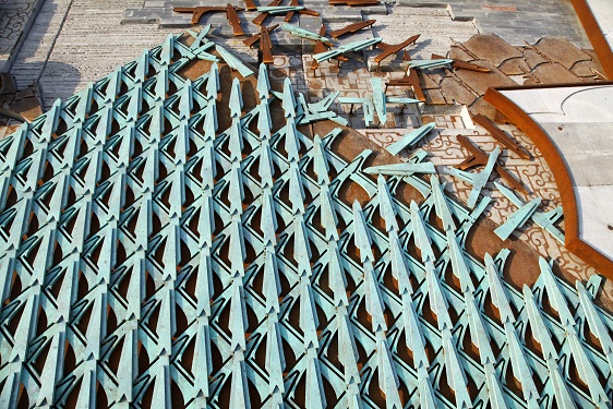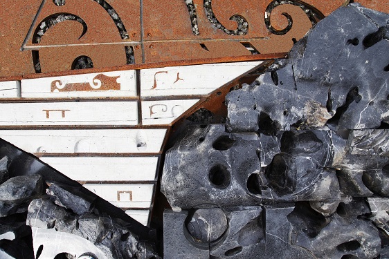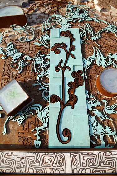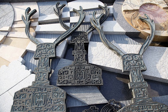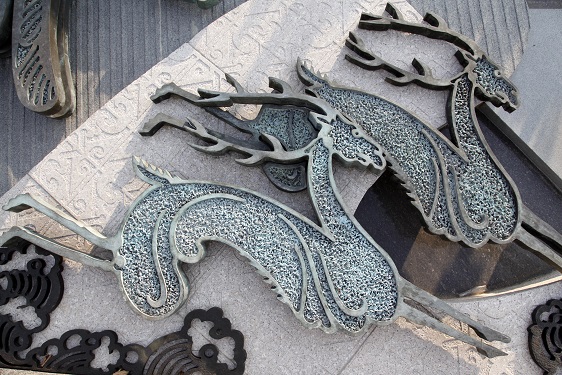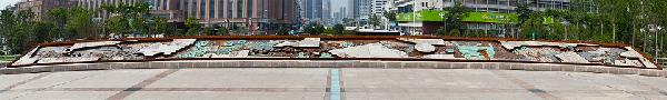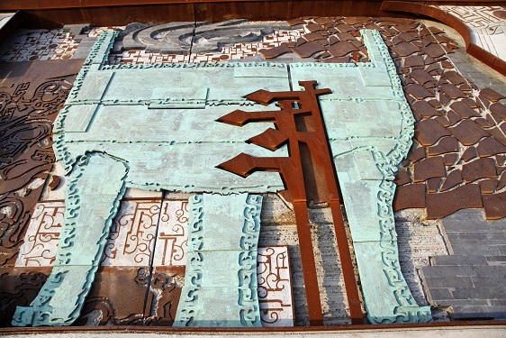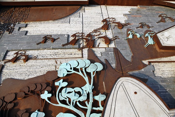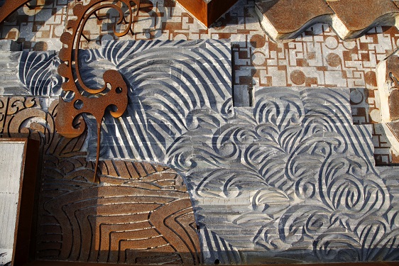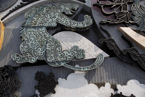 《楚史》分为“创始篇”、“政治篇”、“军事篇”、“文化篇”四幅作品,容纳了十则经典楚事,从四个方面展现楚国在中华历史长河中书写的精彩华章。艺术家通过选取楚文化中具有象征意义或经典造型的系列符号、图案,通过解构重组、类比链接、阴阳互衬、阵列生发等现代艺术形式、语言,运用混凝土、青砖、耐候钢、铜和水琉璃这些材料,进行叙事性与抒情性兼备的创作,既保持了楚文化的古朴风貌,又体现了现代语境下楚文化传承与创新。
